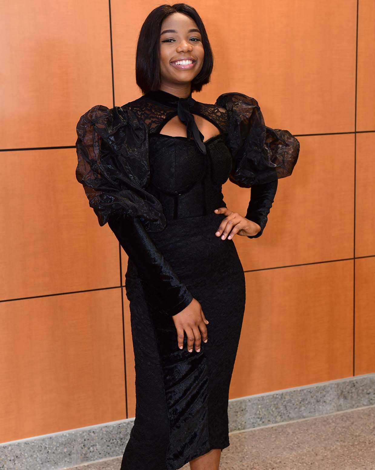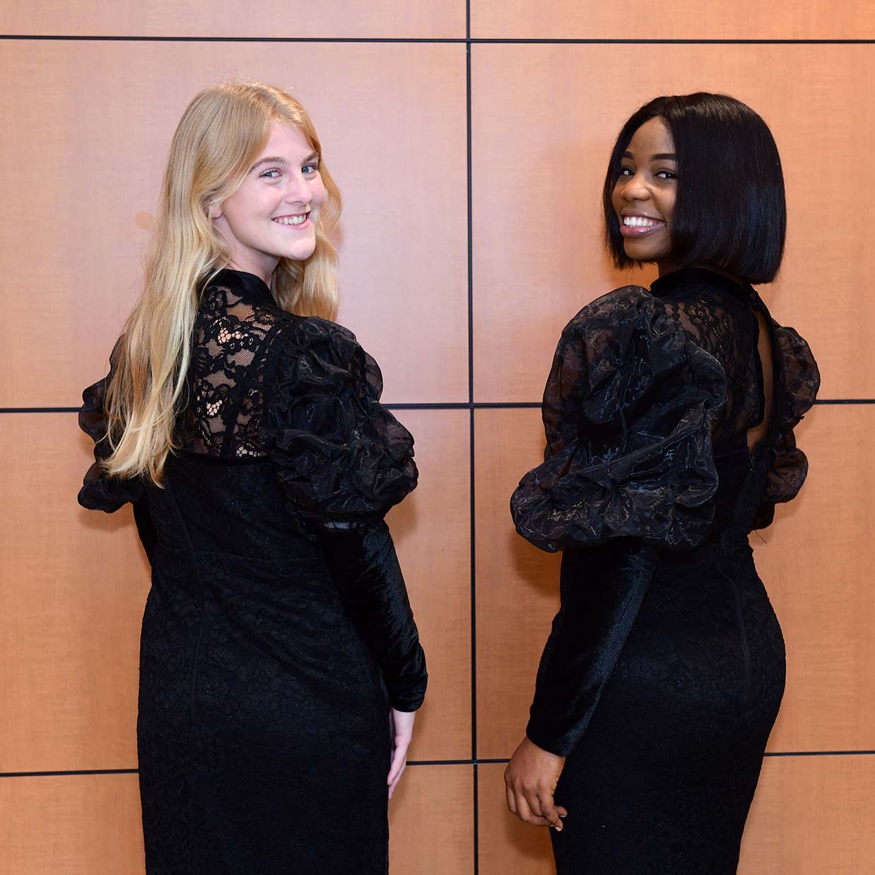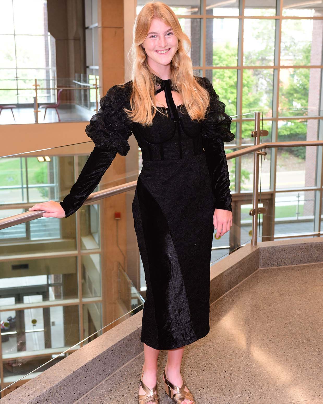 A blackcut out lace dress, with illusion corset, organza, and velvet sleeve