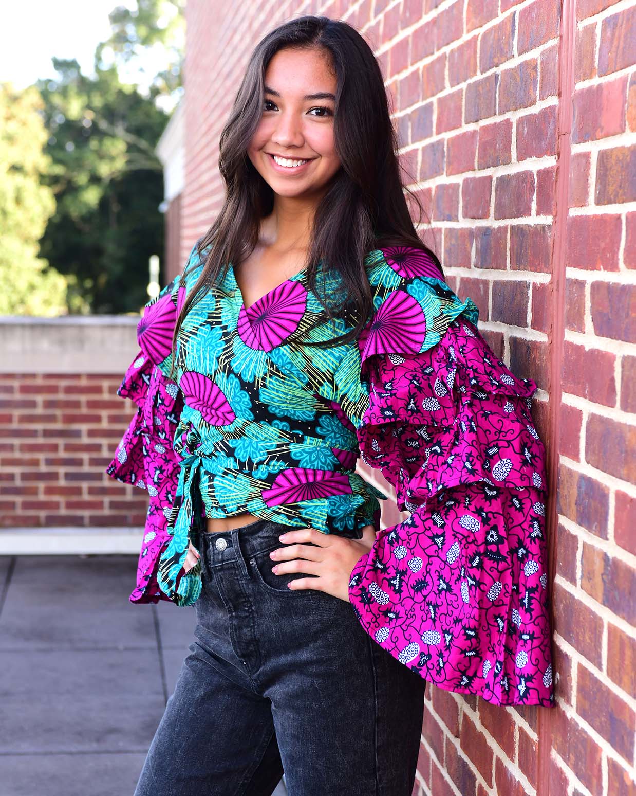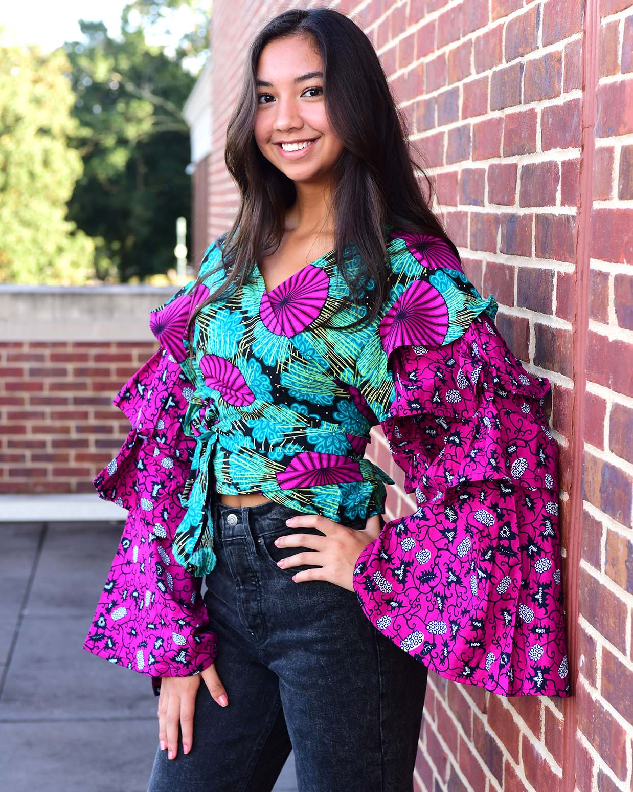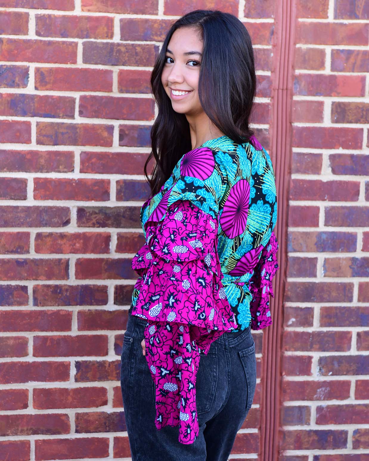 Moji is our one-of-a-kind women's top! It is an Ankara wrap crop top made with a blend of wool and cotton that provides comfort to the wearer. The material is non-stretch but is comfortable enough to wear for casual outings. What also makes Moji unique is the mix-matched prints on each flared arm!